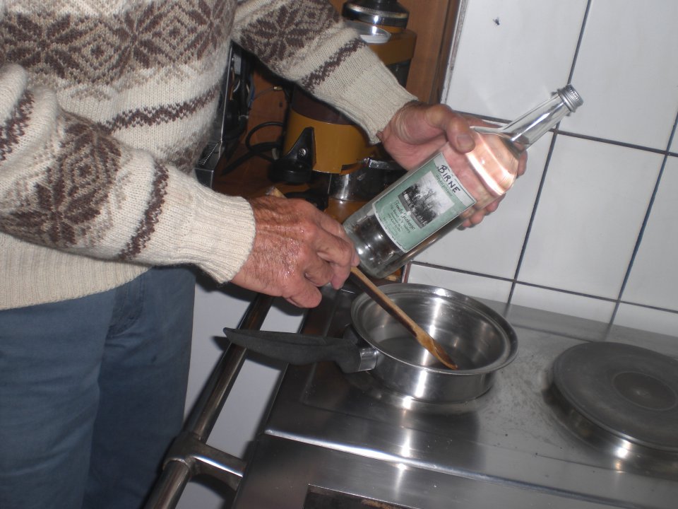vom Tuxer Punsch! Heute in der Früh als wir beim Fenster hinausgeschaut hatten waren wir uns noch nicht ganz sicher - ob wir das Haus wirklich verlassen sollten, denn es zieht gerade eine Kaltfornt durch das Tuxertal. Na ja, jedenfalls haben wir kurzerhand die 2 geplanten Touren in eine verwandelt und sind zum Reinhard auf die Brandalm gewandert! Dort angekommen durfte ich ihm zuschauen, wie er extra für uns den köstlichen Tuxer Punsch zubereitete: Hier das Geheimnis: Butter, Zucker karamelisieren, dann einen Schluck Wasser hinzugeben - mit 1/4 Liter Schnaps (nur das feinste vom feine -versteht sich eh) aufgießen und dann zum Schluss noch mit einem Schuß Rum verfeinern. Egal wie das Wetter ist, wenn du einen Tuxer Punsch getrunken hast, und dann wieder von der Brandalm nach Hause wanderst - ist es auf alle Fälle sehr, sehr lustig!