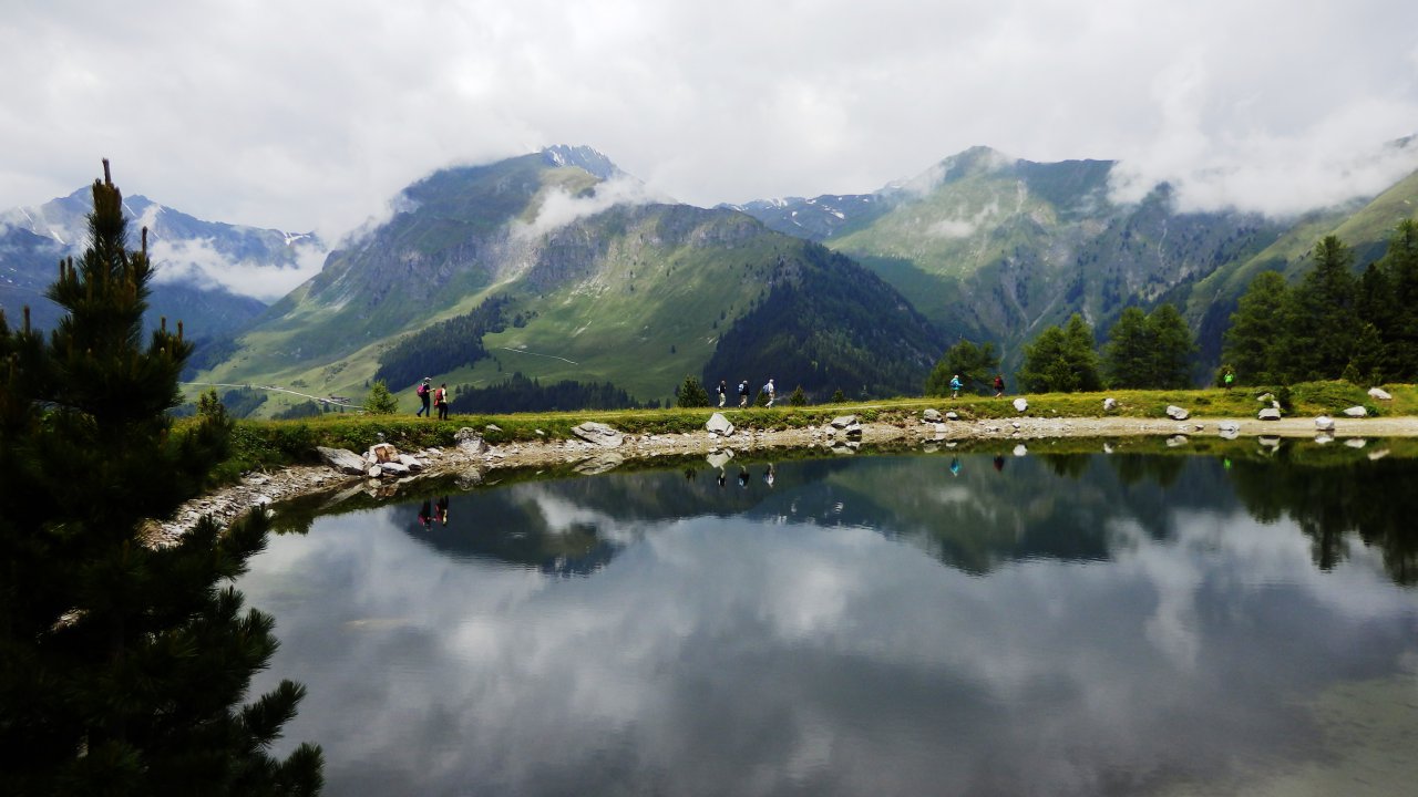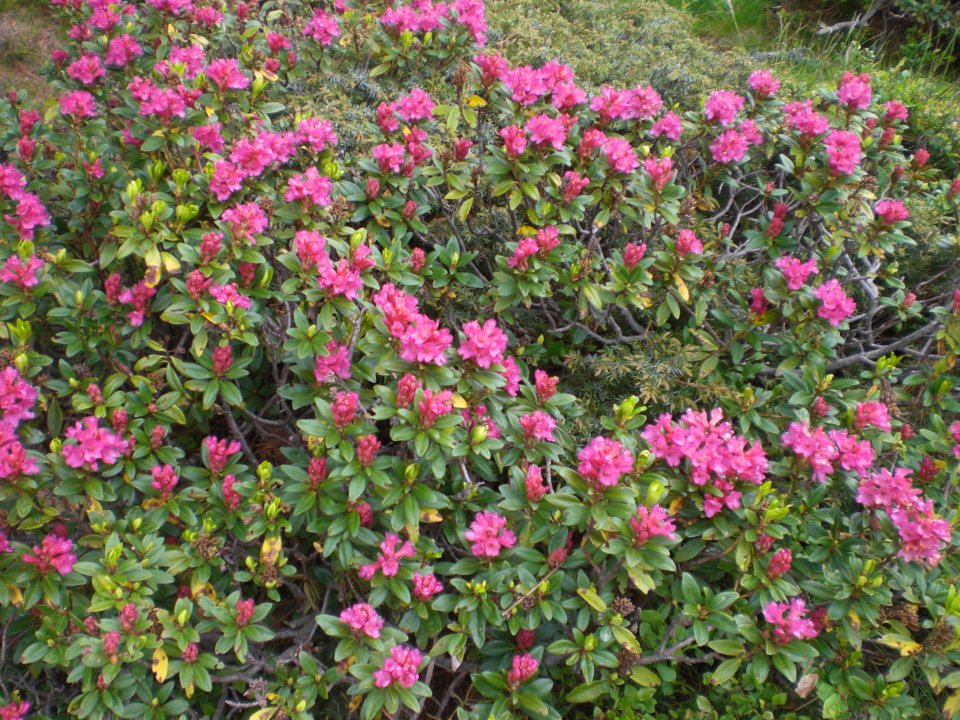 Ein Meer von bunten Almwiesen liegt uns zu Füssen- nur da und dort muss auch noch ein kleines Schneefeld überquert werden.
